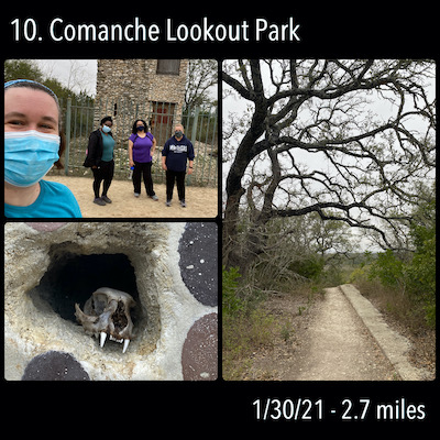 10. Revisiting my favorite park with two folks who had never been there before and one lady who was on her first hike with our group. Someone left that skull on the artwork up at the top. And someone else was flying a drone around up there.