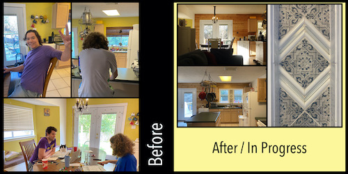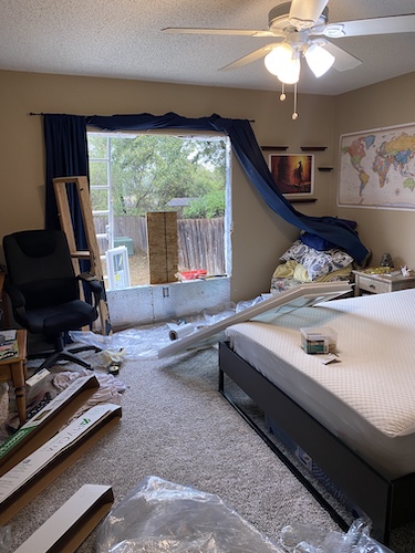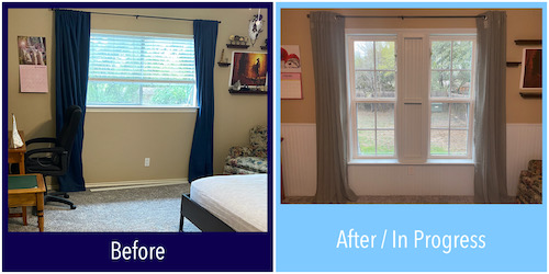 In my room, the wall was torn up from the window-replacement done in 2020 (top photo is from actual window replacement on 12/31). Most of the following work had been done over weekends in 2021, but was finished this week. Wainscoting went up over the damaged wall and the interior shelves between the two new windows was built. Eventually it was all painted a very pale blue. (Difficult to see via photo with the old walls still that ugly brown they were when we moved in.) I also got new curtains that weren’t blackout-style. Eventually, the rest of the walls will be repainted, but that’s luxury instead of necessity, so my room is done for now. (Not pictured: a couple more shelves added to that between-the-windows area.)