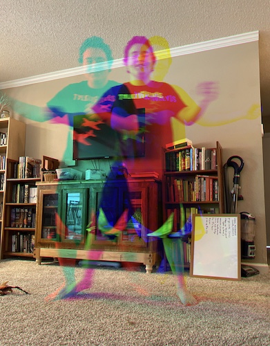 So that was a year ago. Today is my son’s 17th birthday – his second birthday under a global pandemic. (Pic: three-frame dance from a few days ago that we put into a color app, heh.) My middle son, Ambrose, is starting his first job today. The oldest, Morrigan, is up at school in Kansas. I’m grateful that we are all okay. I’ve known friends and family with various severities of covid, and so far, everyone is still here with us. Others have not been so fortunate, and everyone has had to adapt in one way or another. On a personal level, there are a few things that I miss so much that it gives me physical pain to think of them: my local library; in-person 5K events; having my days alone and silent; extended family gatherings; HUGS.