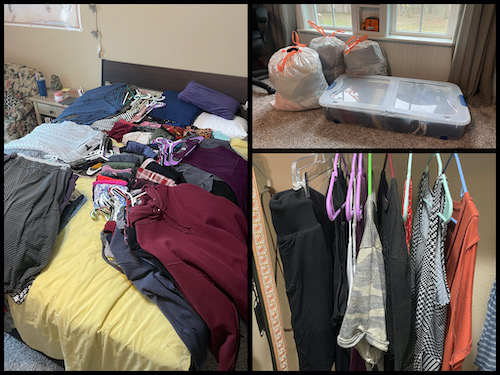 Then, of course, I began rapidly gaining weight in mid-2014. I had to buy more clothes…and more…and more… Eventually, my weight settled into a five-pound maintenance range for many years, and my wardrobe stabilized. However, I had all these clothes that were now too small.
