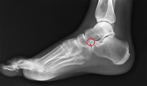 My orthopedic surgeon showed me a cross-section of my foot via the MRI. (I’m still working to get a copy of this photo.) Below is a photo of a normal foot x-ray (not my foot). There’s a red circle on the part of the calcaneus (heel bone) where I had the fracture in 2015-2017. Unfortunately, I never got a photo from that original MRI in Dec 2016, but essentially the fracture went almost all the way through that little nubbin on the top of the bone, where the red circle is. The orthopedist then told me that the fracture nearly cut the entire nubbin off! I’m using this photo as reference for what my current MRI shows, until I can (hopefully) get a copy of the new photo.