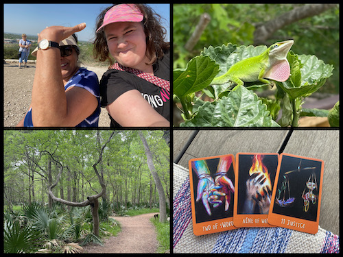 Top: Eva and me playing out on a hike – Eva doesn’t like to take photos, so she skipped one, so I made her take a selfie with me, so she hid and I made faces for the camera. This was such a fun moment! // Neko (yes, I named my porch-lizard) flexes for the ladies. Bottom: headless tree at Palmetto State Park; my very obvious tarot the day I asked for guidance after yoga.