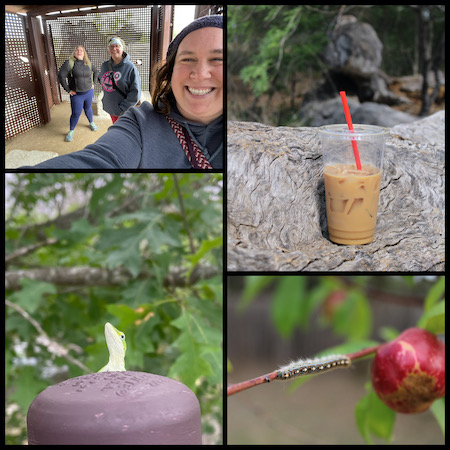 Clockwise from top: One of my favorite hiking group-selfies ever, with Sarah being super-silly in the background, inside one of the shelters over the land-bridge at Hardberger Park; iced coffee on the coolest wiggly sideways tree at Walker Ranch Park; a forest tent caterpillar tries to “blend in” along a branch in our nectarine tree; our porch lady lizard plays peekaboo with me as I try to get her photo (she’s much more afraid of me than Neko).