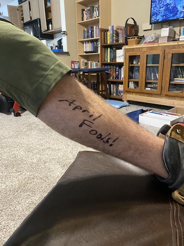 Ambrose came home limping, saying he’d been tapped by a car at the end of his work day at the local nursery. J and I started asking questions about the employer’s response, if the car stopped, etc, and Ambrose said he’d show us the damage. He raised his pant leg to show us this April Fool’s sign… Ha!! My kid.- wildflower hike at Inks Lake