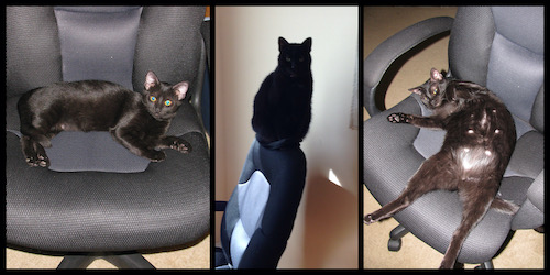Ash had a good, long life. He was just on the cusp of being 12 years old, and he’d been with us for all but the first 4-5 months of his life. He’s the cat who taught me to love animals, who as a kitten would wait for me to eat my food before he started eating, who loved to lay on my office chair and would occasionally challenge me for the seat (below), who literally got high if exposed to catnip, who loved feathers and the laser pointer and crinkly paper, and who hated being laughed at. Ash believed he was human, and I think he understood far more than many cats about the world around him. All my kitties have a special place in my heart, but Ash…Ash was an old friend, an old soul, and a very deep rooted love that only comes from years of experience together.