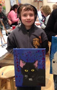 When we get his ashes and paw print back, we’ll hang the paw print under his painted portrait. Laurence created the portrait at one of those paint-your-pet nights when he was ten years old (left), and it was his idea to hang the paw prints there. His ashes will be buried under the aloe vera in our eventual zen garden, so he can remain with us here.