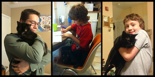 (Morrigan w/Ash before going to college, Jan 2020; Ambrose sharing his chair with Ash, Oct 2012; Laurence on National Adopt a Shelter Pet Day, Apr 2015)