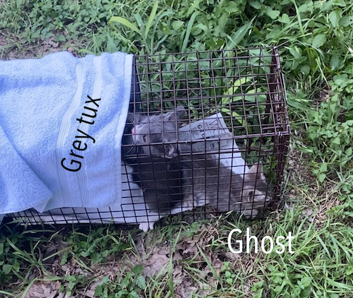 Lastly, there appears to be a slightly older kitten (maybe 12 weeks, but he might not be quite old enough for TNR) who is a grey tuxedo cat. He is not the sharpest hammer in the dishwasher, as Jason likes to say, and has gotten trapped four times. We originally thought that, as a kitten, we could try to socialize him too. He was on the edge of the social window, but we would try. Unfortunately, we moved him to the playpen we were using for the kittens after his first trapping, and he immediately escaped into our garage. We had to open the garage and let him go before he hurt himself. The second time he got trapped, we let him go, only to immediately have him set off the trap again, this time with one of the other kittens inside! We had to use a barrier to separate the two and then let him go so that we could capture the kitten! The third night, he got himself trapped again…like I said, not the sharpest of cats! Unfortunately, the others have watched this guy get trapped multiple times, and are staying away from the enticing food smells.