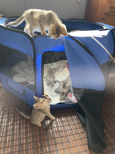 We’ve had no luck trapping the adult cats in the nearby feral colony this week. Well, one night, the mother of these kittens did go into the trap, but somehow it didn’t go off! Ugh! We’re going to try again tonight, but we’ve already contacted the SAFCC to let them know the situation is particularly difficult given that it’s not our colony that we’re trying to trap. They’re looking for a specialized group to come help us, to go and talk to the people at the house directly.