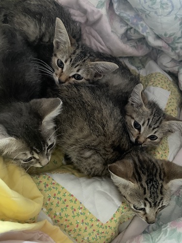The kittens saw the vet Tuesday morning. I was wrong before – all four of them went in together. They had physical exams, fecal tests (they all have roundworms, as expected), and Reaper had some bloodwork done. Sadly, this showed that the kittens are FeLV positive, which means probably the entire feral colony is as well. It’s devastating. We have to be extra careful not to expose the kittens to our adult cats. And feline leukemia is a particularly tricky virus – the vet didn’t expect Reaper to last through the end of the day, much less the end of the week, given her rapid decline. Then there’s the question of how we’re going to get homes for these babies – will a shelter take them? Will we be able to find someone who will give them love and care, rather than euthanizing them? We did finally find a shelter in Austin – Austin Pets Alive – that will take in FeLV+ kittens, and have been talking with them. Fingers crossed! Obviously, they can’t stay locked in the one room forever, but they also can’t join our house, or go back out into the feral colony!