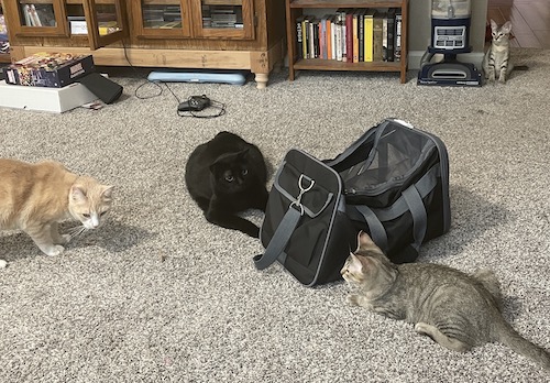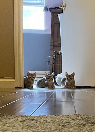 As for the other three, they saw the vet back on the 2nd for their next round of vaccines. At that point, the two boys were up to 5 lbs and Gherkin was up to 4.5 lbs. They were all completely healthy, and we got permission to start integrating them into the household. NOT because we planned to keep them – because no – but because they were getting too big to be confined to the one room. It took about a week for the integration to happen. At first it was just sniffing each other near the doorway of the kitten-room. The kittens were more open to the experience than the older cats, as one might expect. By the end of two weeks, however, everyone was doing well, even Jojo (who we expected would be a problem). Now that it’s been three, Atticus is cuddling and grooming the kittens as if they’ve been here all along, and no one else is much bothered by them. Plus, I’ve never seen the kittens happier than when they realized they had an entire house in which to have zoomies.