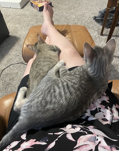The kittens are all adjusting well. Angus, who was already the most attached to us, immediately became a full-blown house cat. He picked up behaviorisms within a day or two – winding in and out of your legs, jumping into your lap, begging to be picked up and held. Gherkin, who was always the most fearful and prefers cats to humans, immediately struck up friendships with as many of the adult cats as would let her. She tried to play with Jojo, cuddle-sleep with Atticus before he was ready, rub all over Nimi. For about a week, she wouldn’t let any of us near her except while in the kitten-room, her safe space. But then suddenly she began sleeping near my feet, jumping on the couch to sit near Jason, and eventually climbing into laps. She still has to be approached slowly and carefully or she’ll run, but she’s definitely transitioning to full-blown house cat as well. And then there’s Ghost, the follower of the group. He learns by observation, and once the other two were comfortable with laps, he started joining. Any time a sibling is cuddling (with cat or human), he jumps in for his share. He mimics the behaviors of our adult cats, including this interesting twitchy-back thing that Nimi does, and he’s coming along well. They’re all due for their next round of vaccines tomorrow.