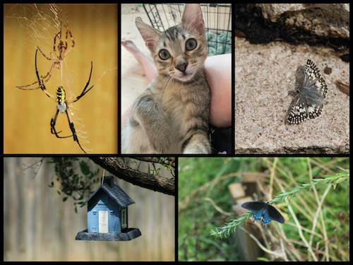 Top, left to right: spider after molting (I got her dropping the shell off her web on video, too!); Angus being held in my arms like a baby (his favorite position); checkered skipper butterfly. Bottom, left to right: the neighbors’ new birdhouse; pipevine swallowtail resting in our wildflower garden