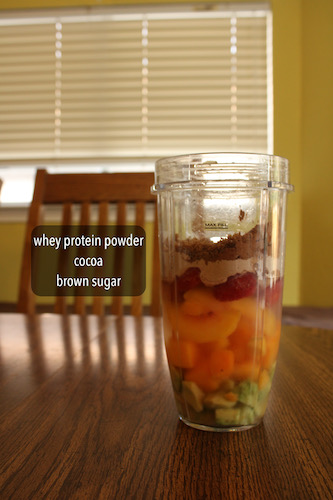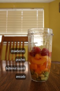 The first step is to pick out your fruits and veggies. The only one that is a must-have for this particular smoothie is avocado. I use frozen avocado just because it’s easier, but you can use fresh as well. There are no exact measurements, but I’d guess I throw in about a quarter to third cup of avocado. For the rest, you can do as you like. Personally, I find frozen butternut squash to be a good veggie for smoothies because you really can’t taste it at all. Fresh summer squash or zucchini is the same. For this smoothie, I use butternut. Then I choose two frozen fruits, usually peaches and strawberries, like pictured here. Depending on how you like to flavor your milkshake, you can use blueberries, oranges, mango, pineapple, cherries, etc. I personally don’t use raspberries or blackberries because their seeds are too big and it ruins the texture, but that’s entire up to each individual. Why frozen fruits and veggies? I don’t like using ice in smoothies, because the texture never gets thick and the ice stays in tiny melting chunks. Most of the time, I’ll use 2-3 frozen items and one fresh, so that it ends up with a perfect thick milkshake consistency.