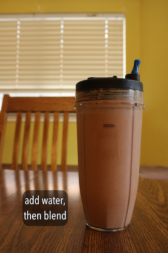 Lastly, add liquid. In this case, I added water, but sometimes I add both water and orange juice, depending on how I feel. I tend to add water up to midway through the top fruit line, though in this particular making (that I photographed), I accidentally added more than normal. The more liquid you add, the thinner the smoothie, and this was more of a thin milkshake texture than full-on Frosty. I prefer the latter! You can tell I added too much by how high above the Fill Line the smoothie goes, heh.