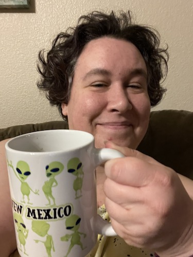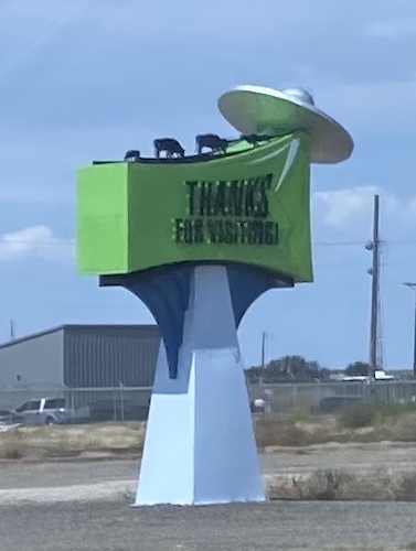 It didn’t take long to cross into a new state, in Texico, New Mexico – a name which had us in stitches. Not long after that came Roswell. We decided to save time by not going through the center of town. Instead, J read me facts about the city – disappointing facts, like one of their high schools’ mascots being the Coyotes, and hilarious ones, like their minor league baseball team being the Invaders. There was little alien stuff on signs and by motels and for sale at those side-of-the-road places that sell metal lawn kitsch. But we couldn’t even buy a stuffed alien at the gas station, so that was disappointing. We also couldn’t find any food besides fast food, so we ended up at Subway. Funny story: I didn’t plan this, but I was wearing my Unsolved Mysteries shirt that day, and two different Subway employees told me how much they loved that show and asked me if I’d seen the Roswell episode with the aliens. Ha! We weren’t even in a touristy part of town!