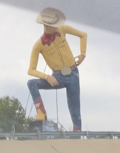We passed the Tire Tree again, which turned into a running joke about tire fruit, tire skins, tire husks, tire pulp, tire seeds… There were a lot of places between Amarillo and the NM border that had heaps of tires or pieces of tire everywhere.- a giant cowboy statue tipping his hat to us