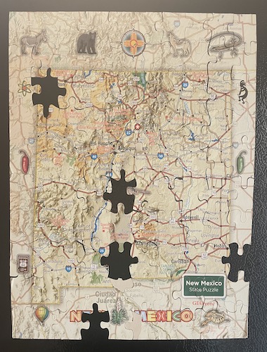 - our rental had a half-done magnetic puzzle of the map of New Mexico on the fridge, and you better believe I finished that puzzle. (It was likely only 100 pieces total, max. And five were missing. But what a fun thing to have in our rental!) (Photo above)