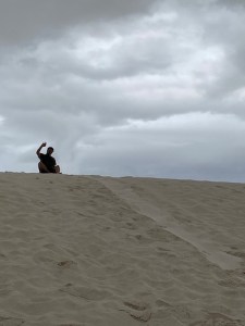 One thing I didn’t discuss in the hike post was the sledding. Everyone told us that we needed to sled on the dunes. When we arrived by the trail we chose, we were literally the only car in the parking lot, but it was clear someone had been there at some point because two sleds had been left behind (grrr!). You can buy them at the gift shop, as well as the wax to make them slide easier, and then sell them back afterwards for part of what you paid. This had been our plan, but instead we grabbed these two that were essentially left as trash. After our hike, we each slid down one of the dunes. Unfortunately, because we didn’t have the wax and because of the on-and-off rain, it wasn’t good sledding weather. We each only went once. But I’m glad we got the experience of it! (PS – We returned the sleds to the visitor’s center, and donated them rather than selling them back.)