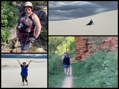 I’m being facetious here, putting up the unflattering photos to contrast the first set, but this IS the reality. In reality, lowering yourself onto a sled without just plopping onto your butt while the sand shifts around you is HARD when your body is very heavy and your joints are stiff and your boobs block your ability to see your feet. Trying to climb up a mountain, even with a gradual elevation, makes your heart race and your lungs gasp. Hip stiffness and belly fat make it difficult to lift your leg high enough to climb up that four-foot-high boulder. Your feet and back HURT when you “walk” (aka mostly stand) as you leisurely make your way around the 1.5-mile path through caves. In reality, when you realize you’ve chosen poorly on your first hike in a week of adventures, you start choosing the safer, easier trails even though you really want to go with the fun, life-changing paths. (And this doesn’t even begin to discuss the psychology and cultural biases and medical care issues – that’s an entirely different issue!)