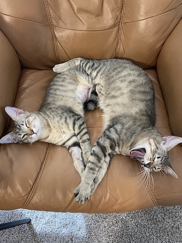 From 11/12 – LOOK AT THEM HOLDING HANDS!! My babies are so sweet now. And still have no homes. So in the meantime, we just enjoy them. Ms Gherks and Angy-boi decided to take a nap together in the rocker I use most often. Cats always gravitate to the places that smell most like their humans – pillows, most-used chairs, etc. These little ones are no exception. (PS – Angus is like twice as big as Gherkin now that they’ve grown into almost full cat size!) (PPS – Yes, Gherkin’s belly is shaved. She had her spay surgery a couple weeks back.)