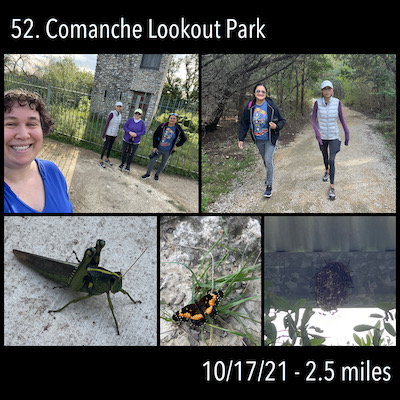 52. We had a beautiful cold front come through before this hike, so it was in the 50s out and just so lovely. Because of the cold – and the potential for mud on the trail – most of the participants dropped out, but the four of us who remained had a great hike filled with nature. I could’ve done without the wasps (eek!), but hey, we actually saved this grasshopper from a cardinal, and that was fun.