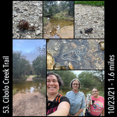 53. This was sadly a hikefail. Apparently the rains that made my last hike muddy did even more damage to this trail! The goal was four miles followed by a picnic, but less than a mile into the out-and-back route, we ran into a creek overflow crossing that was way too long and deep to go through. We’d already worked our way over three thinner crossings, but at that point we had to turn around. It wasn’t a great morning for a hike anyway, tbh. A sudden humid warm front had come through, so it was hot, muggy, and swarming with mosquitos. One of the hikers got the time confused and only ended up making it to the park around the time we were finishing. Because we finished before nine and everything was so wet and gross and hot out, we skipped the picnic. But hey, not every hike can be a success. At least we had some good conversation and got a few miles in!
