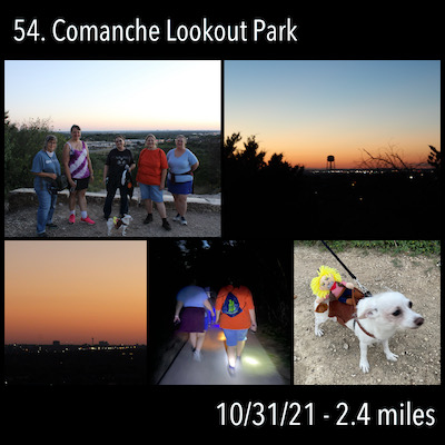 54. Last year, one of the other hike leaders and I hosted a huge haunted hike at this park, complete with costumes, ghost stories, and cold spots on the way down. This year, we had a large initial interest that dropped to only six folks by the night of. Ah well. No costumes, either, except for Buddy the dog! And no ghosts, no cold spots – how disappointing! At least the sunset was beautiful.