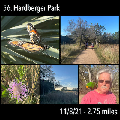 56. I decided to sign up for this afternoon hike last minute, and I’m glad I did. We saw a ton of monarch butterflies (two in the top left photo!), a fuzzy black bee (sadly no photo), and a man walking around with his 24-year-old parrot on his shoulder. There were also a ton of photographers out having portrait sessions as the sun set – pregnancy photos, couple’s photos, etc. And there was a guy flying a drone over the land bridge. Speaking of the land bridge, the plants have grown HUGE in the months since I was last at this park! Before, it looked like a smattering of plantings, and now it looks like actual woodland. I was really surprised how quickly it developed. I guess that’s what happens when you go with all native plants!