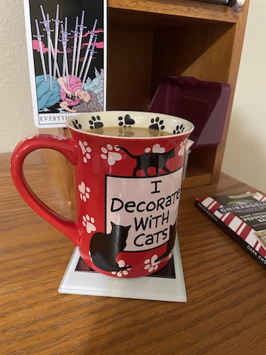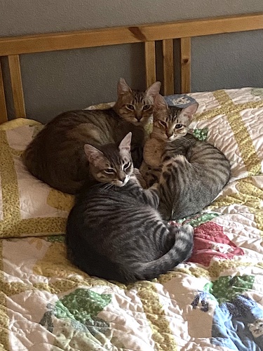 Yeah, you heard that right. By next year. Because these three are firmly bonded to each other now, and very attached to two of our permanent residents, and they’ve lived with us for five months now, since they were eight weeks old. It would be cruel to put them into a shelter situation, or to separate them. We have no resources to help them get adopted, much less adopted together, so this week, Jason and I decided that we’re just going to have to let them stay. So we have seven resident cats now – something no one actually wanted or planned for, but hey, that’s life, right? If people can have seven kids, we can have seven cats…