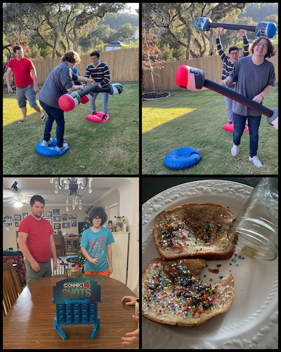 On Christmas eve, we spent the afternoon with a few members of my dad’s side of the family, including my brother (who I last saw in April) and my half-sister (who was in California for her first semester of college this fall). We had a hilarious white elephant exchange, and afterwards played a blow-up gladiator game outside. At home in the evening, we Zoomed with Jason’s family for our annual Christmas gift swap, and then per tradition, each of us opened one present before bed. Mine happened to be Connect Four Shots, so we had another rambunctious and fun game before everyone settled down for the night. Ambrose and Laurence put out brandy and fairy toast for Santa instead of milk and cookies. It was awful. Jason took one bite, while I took one sip of brandy, and then Jason poured the brandy over the toast and wrote a note back to the boys to scold them. Ha! It’s become a Thing to have Santa and the boys in a verbal spar every year.