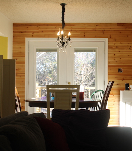 - added wooden shiplap with shellac to the internal kitchen wall, plus a tile backsplash and shelving area around the new windows