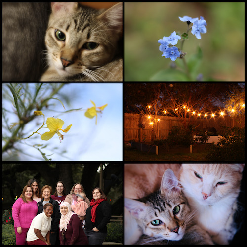 Clockwise from top left: my Angus looking like a perfect angel; forget-me-nots re-blooming; my dad and stepmom’s garden glittering on Christmas evening; Gherkin and Atticus cuddle; some of the best friends a person can have; yellow flowers whipping in the wind after a hike