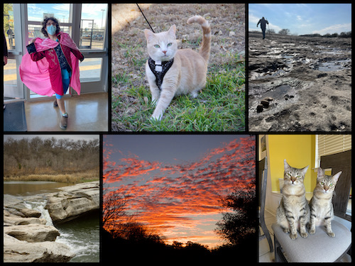 Top, left to right: Ambrose dressed up for the musical (full story in my highlights below); Atticus training to become my adventure cat; hiker silhouetted on craters at McKinney Falls State Park. Bottom, left to right: McKinney Falls, upper falls; sunset; kitty siblings