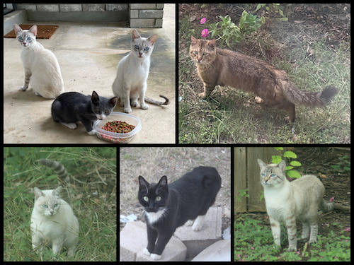 We live at one end of our neighborhood and very near the original colony. Our kittens of course came from that colony, and we were working to TNR the adults until the folks next door to the hoarding house took over** the colony. We still get regular visitors to the yard, including the four siamese cats – though the two sisters in the photo together (our kittens’ mom and aunt) stopped showing up*** anywhere several months ago – a tuxie that I think is someone’s pet; and Big Papa, likely our kittens’ father and a cat that is seen just about everywhere on the streets in our part of the neighborhood.