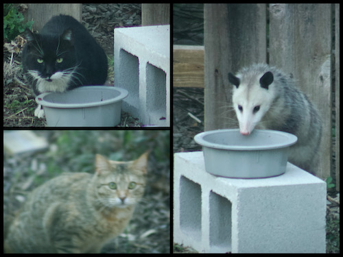 (Top left: new tuxie; bottom left: brown tabby girl with orange patches and white tail tip; right: possum, because apparently we’re going to feed all the wildlife)
