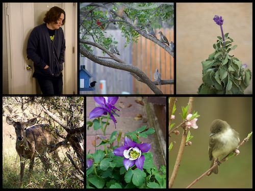 Top, left to right: Laurence as an adult, looking like he belongs on a 90s album cover; the biggest bully among the birds; mystic spire bloom. Bottom, l to r: deer seen at Hardberger Park; columbines in bloom; Eastern Phoebe. Full versions of all these photos can be seen on my instagram stories.