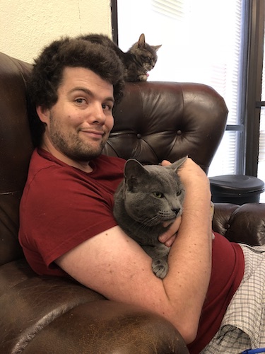 I asked the woman what her cat (now named Wheatley) went by at the Cafe, and she said it was Goose. Stephanie and I both lit up. We both knew Goose. Furthermore, Jason LOVED Goose. If Goose hadn’t been a cat who preferred a calm, quiet household with no or few other cats, we may have adopted him. Jason loved him so much that I literally have a picture of him holding Goose (pic from Feb 2018). I had to pull up the photo to show Goose’s mom. (And no, somehow we never exchanged names. Even though I texted her the photo and the person she was with took a photo of the two of us with Wheatley’s completed painting. Heh.)