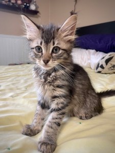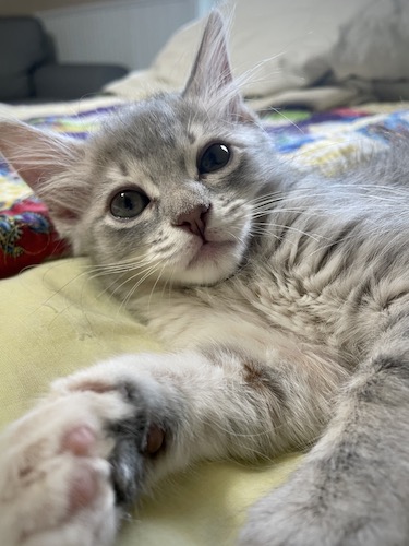 Visitors are limited to handling two kittens, but I was only there to visit two. I explained that I’d been their foster mom and was visiting them post-surgery. They brought Shai out first for me.