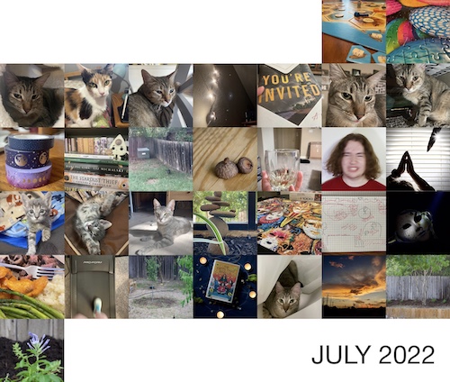 It was an insane month in Cats. First, there was the whole issue with our foster cat Sunflower and the upper respiratory infection she brought into the house in late June. She spread it to our other cats through Angus, who was interested in sniffing her under the door to the foster room. While our older cats only got mild symptoms, the three one-year-old siblings got extremely sick, coughing and sneezing and feverish. (And in Gherkin’s case, drooling and gunky-eyed, too.) The vet said it was just a virus, though, and we let it takes its course. They’re still coughing periodically, but are mostly better. I do wonder if their extreme reaction is because it’s their first exposure (like babies with the common cold) or if it has to do with them being exposed to feline leukemia as babies. They fought off the virus and are FelV-negative (unlike their sister Reaper, who went off to a special program for FelV cats last summer), but the exposure can cause a weakened immune system.
