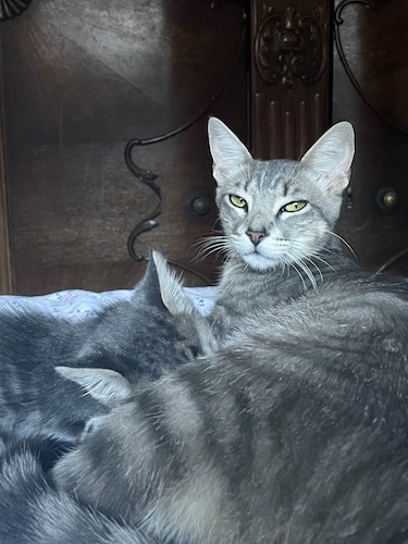 In any case, they’re better now, and Sunflower went off to the shelter for spay on the 10th, and was adopted on the 22nd. Yay! Adult cats often take a lot longer to be adopted, so I’m glad she went so quickly. She was so sweet and absolutely would love to be an independent family-kitty! And of course, there was the whole bit with the Wild Feral Family that I wrote about, and the mom-and-daughter fosters who came after, and who are still here with us for a few more weeks. And lastly, after almost six weeks of treatment for ringworm, Penny and Tillie finally got put up for adoption! It took less than two days for little Penny to get adopted, and while Tillie is still waiting, I’m happy to say our neighbor went to visit her, and she’s looking gorgeous (pic)! Hopefully someone adopts this sweet baby soon!