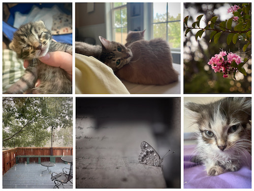 Top row, left to right: baby Schnitzel; nap time with cats; crepe myrtle blossoms in the sunset