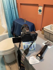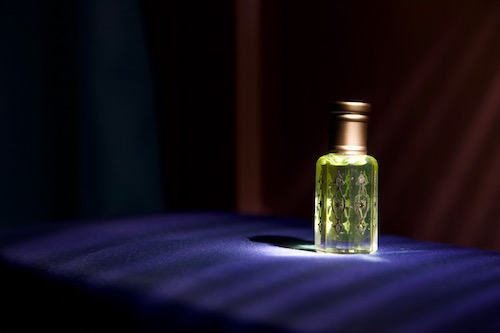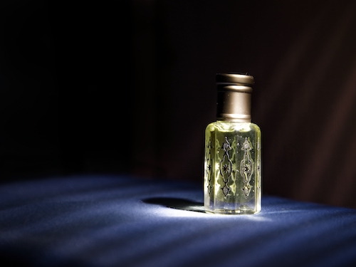 A recent online project had me itching to try my own, so I decided to make a spotlight photo (single light source, using a cucoloris, or cookie). I chose a small bottle of scent I’d bought from Turban de Moda at the Muslim Culture Fest in Austin the previous weekend for my subject. The bottle is absolutely gorgeous and I thought would make a great spotlight! Now, I don’t have a studio, professional lighting, or special tools to make this kind of photography easy. Literally, I set this up in my bathroom, an old curtain thrown over the back of the toilet, camera propped up to the right height by a tissue box, my cookie made by cutting strips out of an index card and then taped to a flashlight for my light source. I set my camera to 85mm, 100 ISO, f5.6, and 0.8 seconds, then put it on a timer so that I could press the shutter and then get the flashlight into place before the photo was taken.