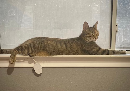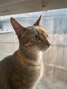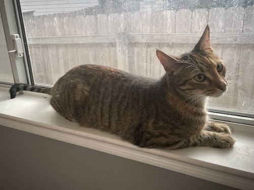 Meet Sunday, the sweetest little calico brown tabby ever. Of course, when we first brought her inside, we weren’t sure what we were dealing with. Was she a community cat that was friendly but could turn feral at any provocation? Was she someone’s lost pet? Was she an indoor/outdoor free-roaming pet that just happened to be at our house at that exact moment? I recognized her tail – she moves it in this double-curled way that is very distinctive – from an overnight video of a cat we took back in April. This cat had only appeared on camera the one time, but it reinforced the idea that this might be an indoor/outdoor pet or a friendly community cat.