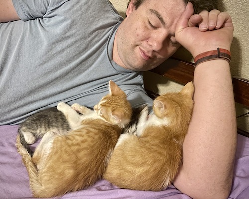 Rillo, the boy who exudes every characteristic you’d expect in an orange kitten with a shared brain cell (iykyk), who has run headfirst into poles and walls because he was too focused on something else to notice them, who has to be picked up when you enter the room and cuddled on his back for belly rubs, and will lick your ears if you don’t stop him. Constant, nonstop, loud, instantaneous purrs.