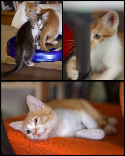Wednesday morning, it was time to finally say goodbye to Austin (Gremlin), Abilene (Abby), and Amarillo (Rillo/Willow). This batch of fosters had been with us for about 5.5 weeks, and we’d nursed two of them from the brink of death due to calicivirus. All three had grown happy and healthy and friendly and sweet. Abby loved to sit in your lap, while the other two scrambled up to your neck and shoulders so they could be right up as close as possible. (In this pic to the left, you can see the two boys simultaneously fighting for my cuddles and cuddling with each other – this was a daily thing!) All three were very attached to each other, and would tangle about in piles when they slept. They were also extremely attached to Jason. Whenever he got home or would walk into their foster room, all three would go from dead asleep to excited in an instant, running off me with their tails up high so they could go to the door to greet him.
