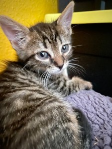 Lastly, these two siblings are very strongly bonded to each other. TBH, this is the only thing that concerns me about them, because the shelter we foster for doesn’t require bonded pairs to be adopted together. They’re a no-kill non-profit trying to save as many animal lives as possible, so they don’t have the luxury of waiting for an adopter to want two kittens. Dexter and Dee Dee are brown tabbies, the most common kind of kitten around and the ones mostly overlooked unless they have special features that endear them to folks. Having (potentially) one eye and mild wobbly syndrome isn’t exactly something most people will take on, even though the wobbly part is so mild that it doesn’t require any accommodation at all. Taking on two brown tabbies with wobbly syndrome and possibly one with a single eye? It’s unlikely to happen. So these two, who literally won’t use the litter or drink water or eat without each other, are 99% likely to be separated, and that breaks my heart.