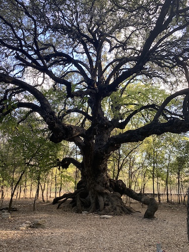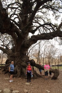 If you go just a little ways off trail and into the woods, you’ll turn a corner and find a gigantic double-trunk live oak tree that is several hundred years old. Despite its size, the tree can’t be seen from the trail, even though it’s maybe 50 feet max away and the trail is easily visible from the tree. Pictures don’t do justice to the size and majesty of this thing. I’ve watched people stop dead in their tracks the first time they see it. It’s that breathtaking.