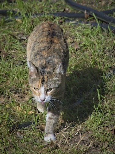 This is the story of a calico. The calico has shown up a few times on our overnight camera, in April, August, and twice in September. She began to show up during the day not long before Christmas, and seemed to figure out that we keep cat food in our yard throughout the day for the ferals. As far as I could ascertain, the calico was an unfixed stray and not someone’s indoor/outdoor baby.