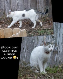 But we weren’t giving up. Jason re-baited the trap, this time with tuna so that our little girl couldn’t just stretch her neck out and pull full fishies towards her. She’d have to take an extra step onto the pressure plate. We hoped. Unfortunately, the next cat that appeared wasn’t the calico, or King, or Unicorn. It was Mustache. I don’t know Mustache’s real name, but he’s someone’s fixed indoor-outdoor pet who is super greedy for food. Mustache didn’t need tuna, but he certainly wanted tuna. So after marking the insulated home we made for Lord Grey with his own scent (thanks, Mustache!), he sauntered into the cage and got himself trapped. Calico: 1, Amanda: 0, Mustache, -1.